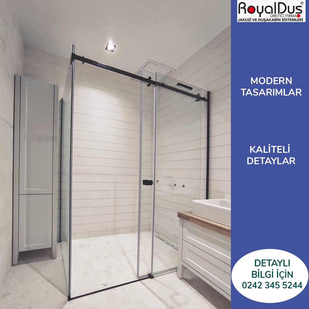 Kaş ve Kalkan’da siyah duşakabin tercih ederken kaliteyi ön planda tutmak gerekir. Royal Duş A.Ş. üretici firma olarak uzun yıllardır dayanıklı, estetik ve modern duşakabinler üretmektedir. Siyah renkli modellerde kullanılan profiller özel kaplama teknikleri ile paslanmaya karşı korunur. Ayrıca temperli cam seçenekleri ile hem güvenlik hem de şıklık bir arada sunulur. Royal Duş A.Ş., özel ölçülere uygun üretim yaparak her banyonun mimarisine uygun çözümler geliştirmektedir.